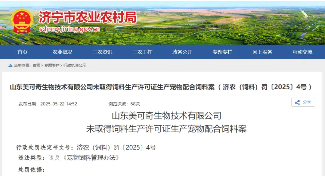 当天,美可奇还因另一项违法行为再遭处罚。2025年3月6日执法人员对山东美可奇生物技术有限公司执法检查,通过核对仓库中存放的风味全功能犬粮包装上的饲料生产许可证发现当事人无宠物配合饲料生产许可资质,只具备添加剂预混合饲料生产资质。