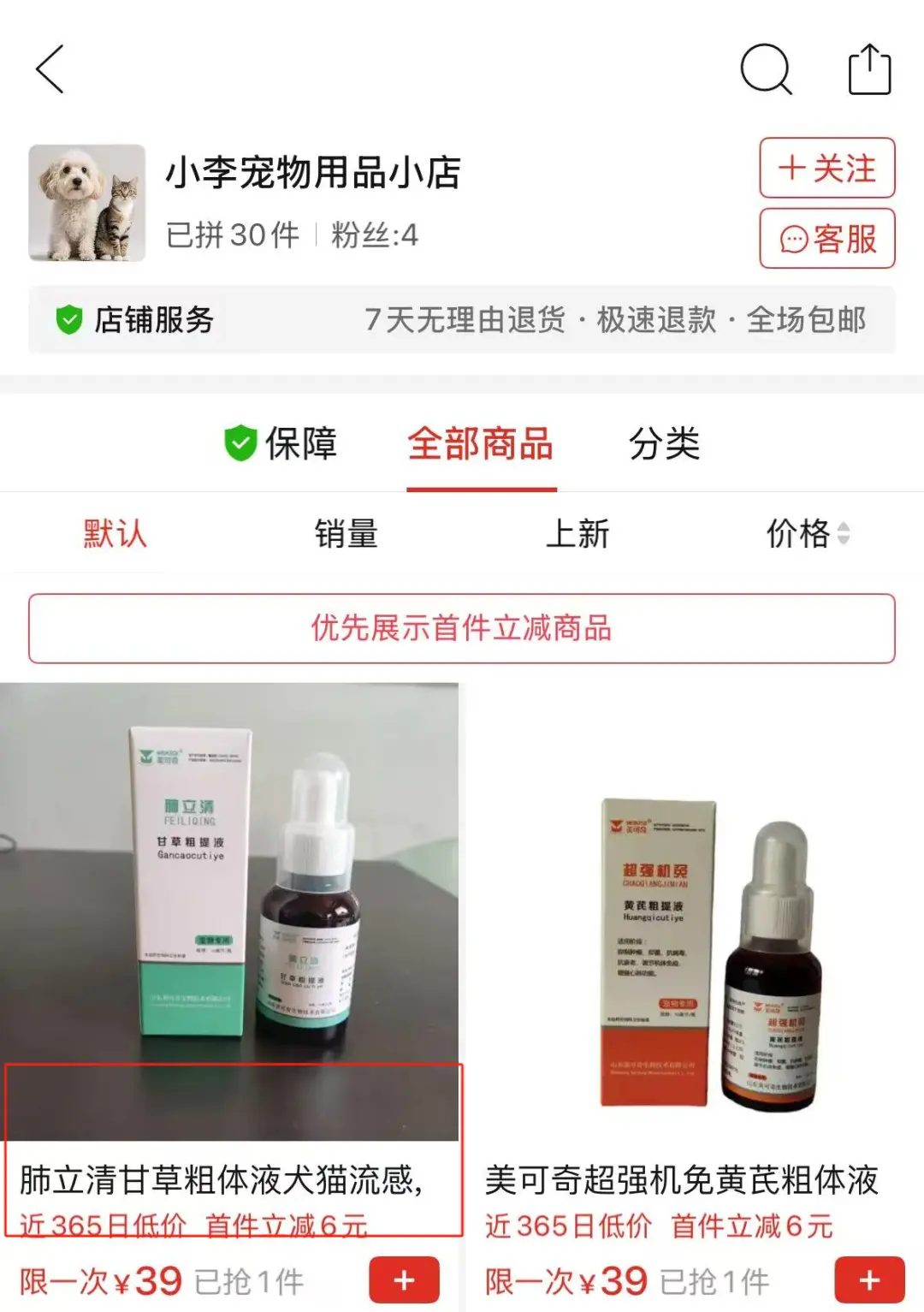 但是在一些电商平台,美可奇的无证产品并没有被下架。在一家名为“小李宠物用品小店”的店铺中,可以看到目前仍有上述行政处罚书中提到的假兽药——“肺立清(甘草粗提液)”,这也进一步暴露出监管在“事后追溯”和“全链条清除”上的滞后性。