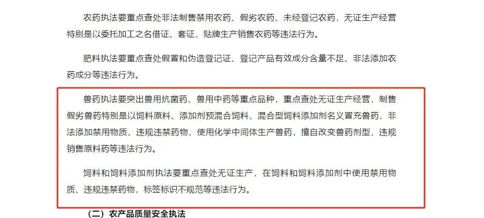 2024年,农业农村部曾发布《关于开展2024年“绿剑护粮安” 执法行动的通知》,指出兽药执法要突出兽用抗菌药、兽用中药等重点品种,重点查处无证生产经营,制售假劣兽药,特别是以饲料原料、添加剂预混合饲料、混合型饲料添加剂名义冒充兽药,非法添加禁用物质、违规违禁药物,使用化学中间体生产兽药,擅自改变兽药剂型,违规销售原料药等违法行为。